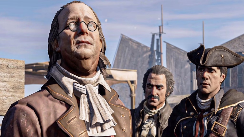 In Assassin’s Creed III, Franklin appears as a memorable supporting character in the context of the American Revolution, where the protagonist Connor encounters him at various moments, including the iconic kite episode during a storm. Before this, chronologically, he plays a significant role in Assassin’s Creed Rogue, set during the Seven Years’ War. In this title, he interacts with the Assassin Hope Jensen and the protagonist Shay Cormac, providing inventions and weaponry, such as a prototype grenade launcher, and later helps Shay in Paris gain entry to the Palace of Versailles. Throughout the franchise, he is portrayed as a clever, humorous man guided by his scientific curiosity, frequently getting involved in the middle of the secret conflict and having ties to both Assassins and Templars, without formally belonging to either group.